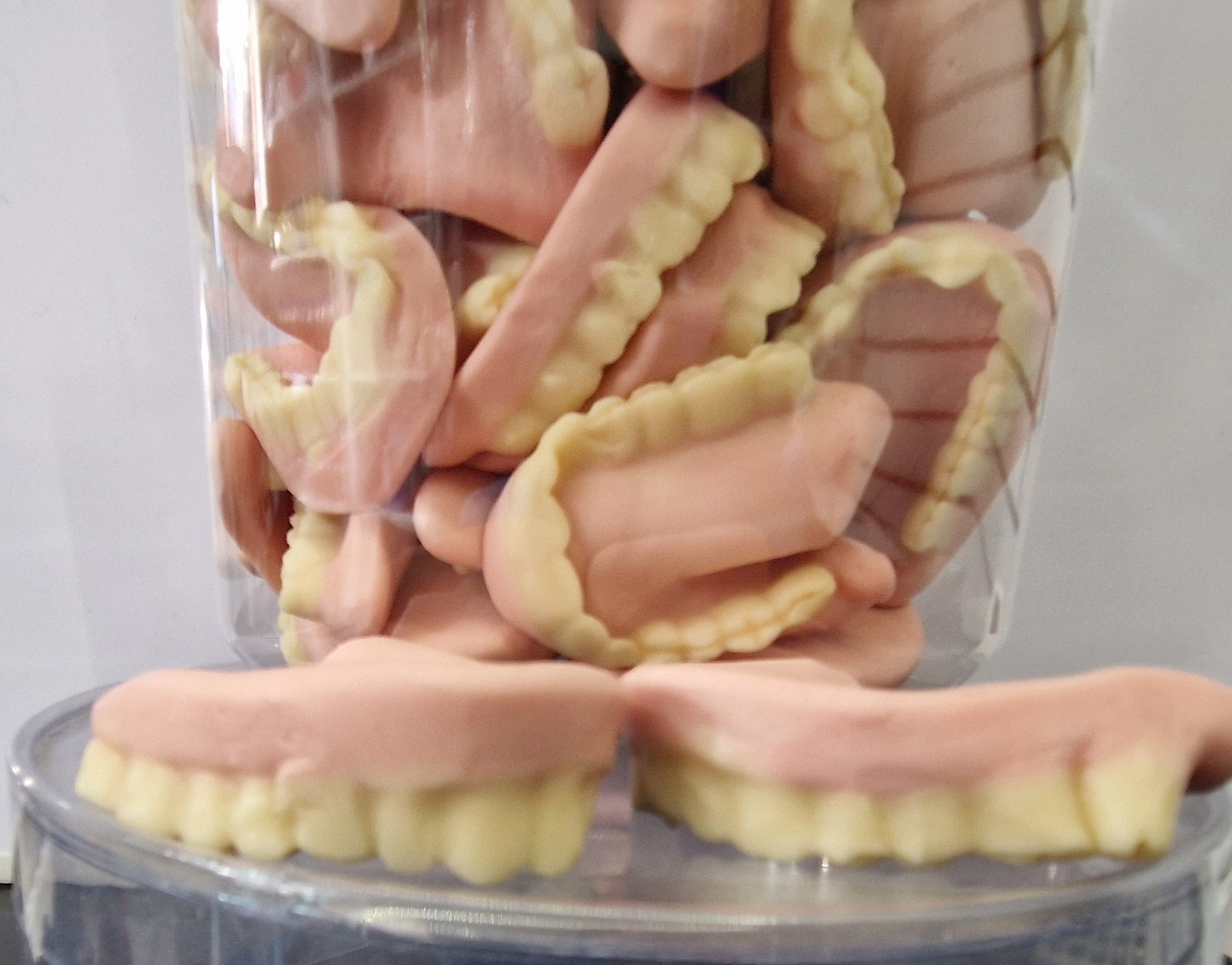 Ingredients: glucose syrup, sugar, gelatine (pork, beef), acid: lactic acid; gelling agent: pectins; flavouring, vegetable and fruit concentrates (radish, blackcurrent, carrot), glazing agents: carnauba wax, beeswax.